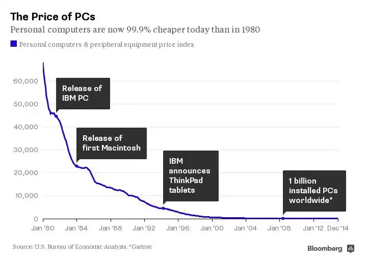 As shown in the chart below, the price of a personal computer today is 99.9% cheaper than in 1980.