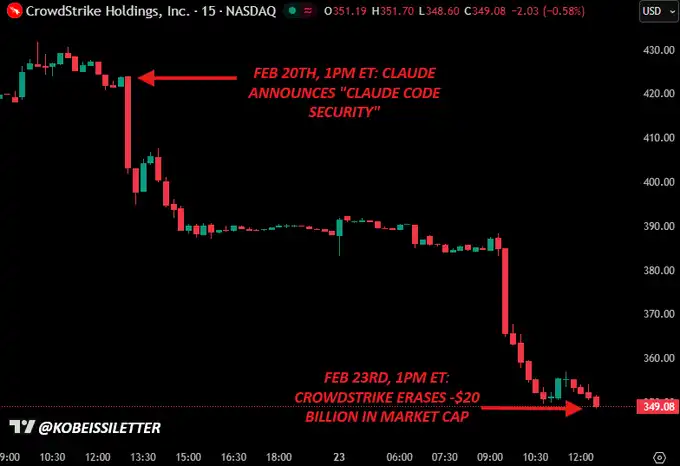 In the above example, CrowdStrike stock ($CRWD) plummeted almost instantaneously when Claude announced "Claude Code Security."