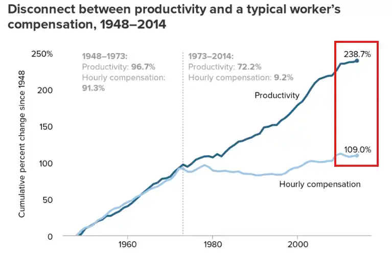 This may explain why productivity has outpaced wage growth over the past 70+ years:
