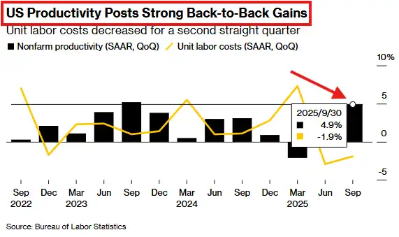 As shown in the graph below, productivity has already started to surge due to AI. In the third quarter of 2025, US labor productivity accelerated, marking the strongest growth in two years: