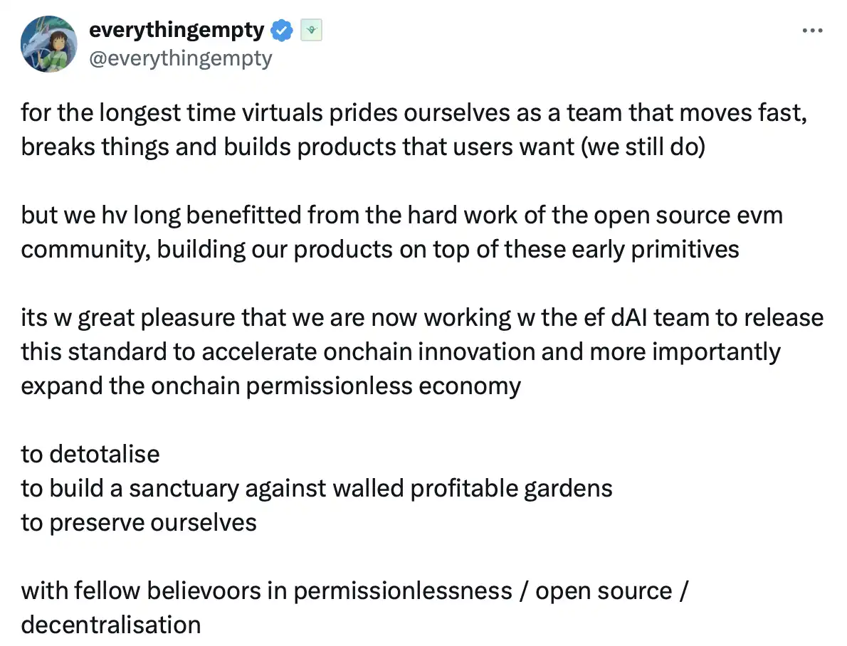Virtuals' key contributor @everythingempty admitted one thing in a post: for a long time, Virtuals have been proud of their fast action, breaking norms, and building products that users truly want. But they have long benefited from the massive efforts of the open-source EVM community, with products built on these early infrastructures.