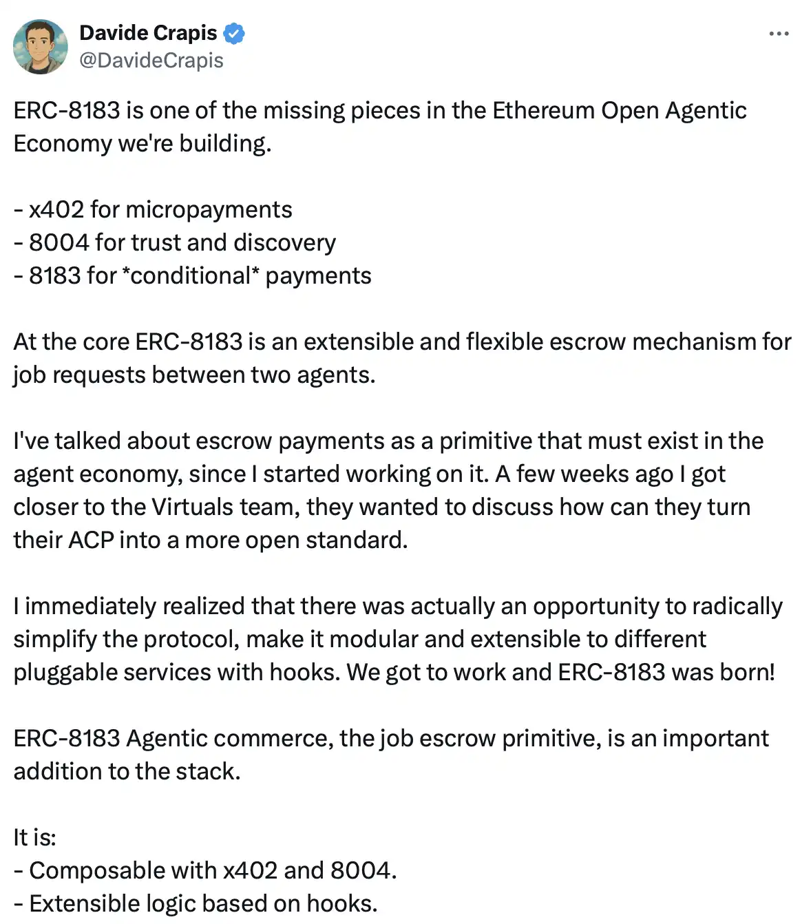 Crapis wrote on Twitter about the three-layer structure they are building: x402 for micropayments, ERC-8004 for trust and discovery, ERC-8183 for conditional payments.